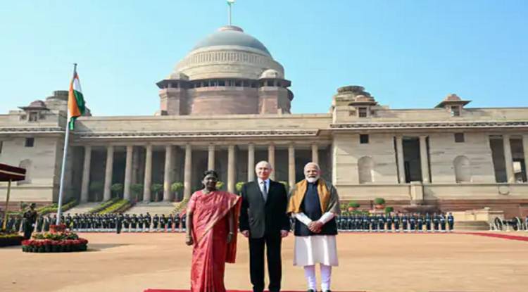 रूसी राष्ट्रपति व्लादिमीर पुतिन चार साल बाद भारत के आधिकारिक दौरे पर पहुंचे हैं। गुरुवार सुबह राष्ट्रपति भवन में उन्हें 21 तोपों की सलामी और गार्ड ऑफ ऑनर देकर सम्मानित किया गया। राष्ट्रपति द्रौपदी मुर्मू और प्रधानमंत्री नरेंद्र मोदी ने उनका औपचारिक स्वागत किया। इसके बाद पुतिन राजघाट पहुंचे, जहां उन्होंने राष्ट्रपिता महात्मा गांधी की समाधि पर पुष्पांजलि अर्पित कर श्रद्धांजलि दी। राजघाट से सीधे वे हैदराबाद हाउस पहुंचे, जहां पीएम मोदी के साथ उनकी द्विपक्षीय मुलाकात हुई।